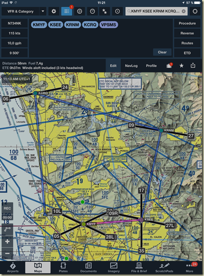 La petite boucle classique vue depuis Foreflight : départ de Montgomery (KMYF), cap à l’est vers Gillespie (KSEE), puis le nord vers Ramona (KRNM) pour un touch&go, on continue à l’ouest vers Palomar (KCRQ) pour la même punition et le retour par la côte en visant Mount Soledad (VPSMS).