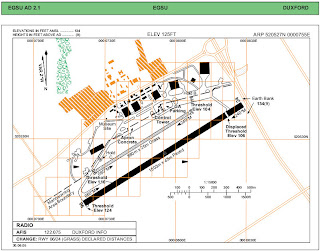 123.6 affiché sur COM1. On commence à écouter. Après quelques minutes, on devine le terrain de Cambridge. A la radio, il y a déjà du monde. Nous n'étions pas que 6 avions français à aller à Duxford. L'approche est pas mal occupée. La carte VAC de Duxford m'est tendu de l'arrière. Je l'attrape et la parcours rapidement. J'écoute la fréquence pour visualiser la position des autres trafics, l'organisation du terrain, du tour de piste, des obstacles... Je ne comprend pas... La radio parle d'une piste 23 ? La carte que j'ai sous les yeux ne correspond pas. Je n'ai pas de 23. Mais deux pistes sécantes. Qu'est-ce-qui cloche ?